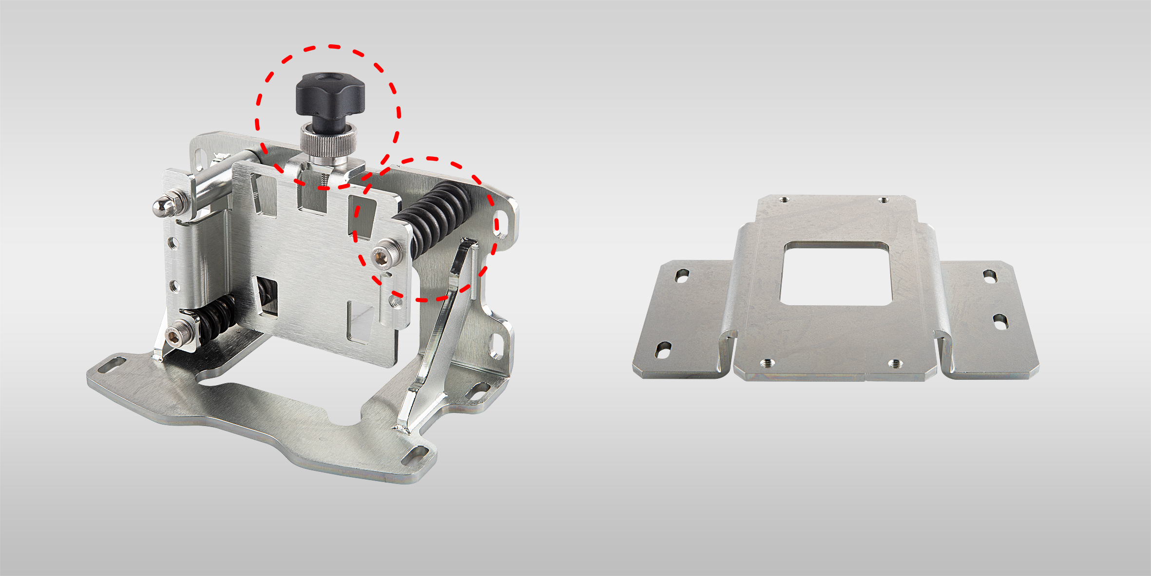 Modular mounting and simplified laser alignment are supported by both the EOSM300-1 and EOSM300-2 models. The EOSM300-1 is secured with black adjustment screws, and its mounting angle is adjusted via three spring screws. The EOSM300-2 provides multiple mounting options and is designed to be used in conjunction with the EOSM300-1.