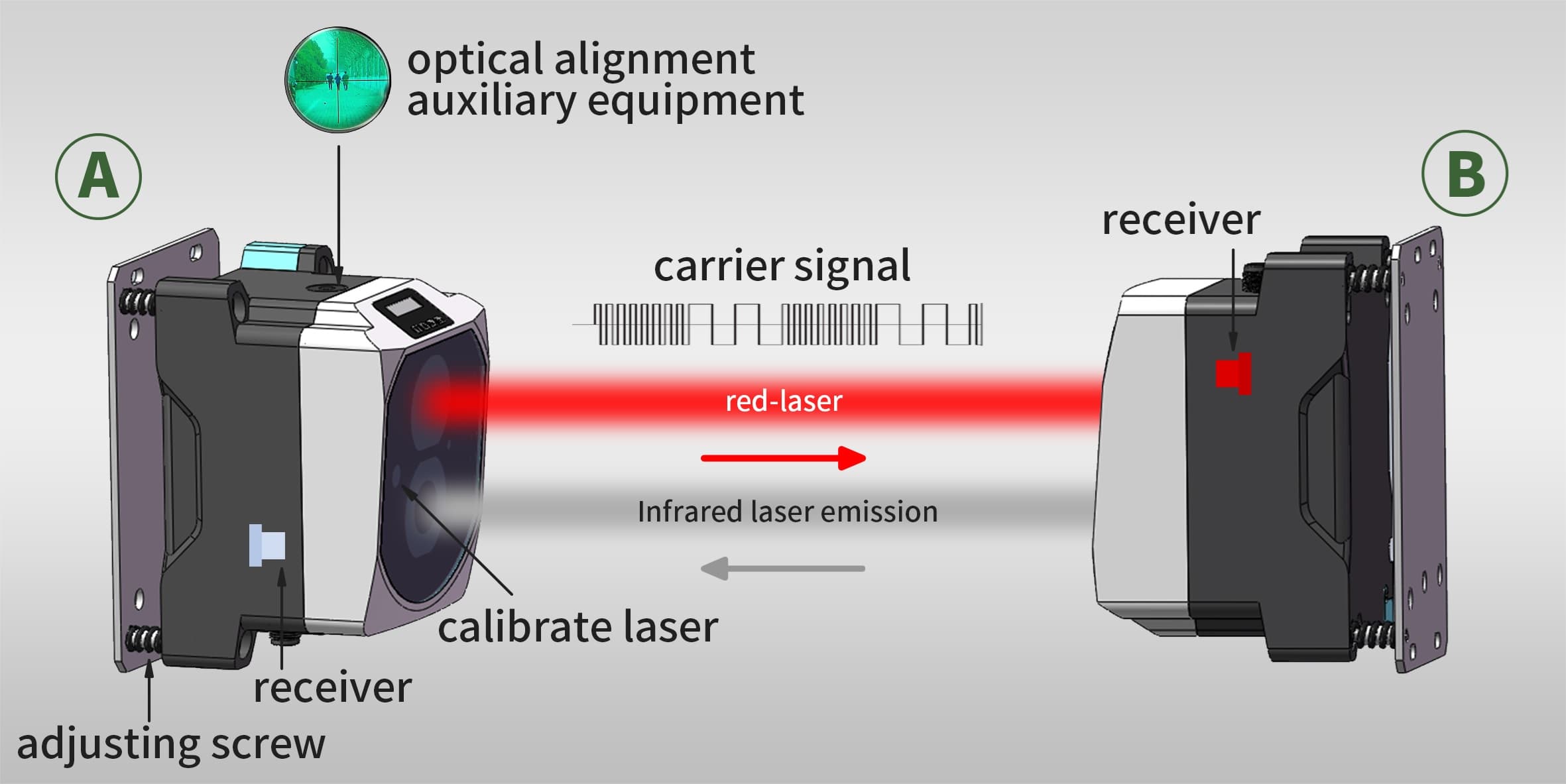 The A and B units use different light sources, combining red and infrared lasers to enable two-way data transmission with a range of up to 120 meters and a real-time transmission rate of up to 100 Mbit/s. The ODC300 is equipped with a calibration laser, optical alignment tools, leveling aids, and a device status indicator. Modular installation and simplified laser alignment allow for easy adjustment of the laser emission angle by tuning the optical data transmitter and the pre-installed base plate set screws. One person can complete the optical alignment process with ease, significantly reducing setup complexity.