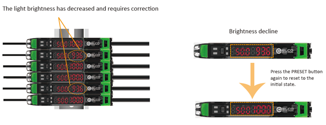One click preset value function: Multiple sensors are cascaded and can be set with just one click. Press the PRESET button once to simultaneously set sensitivity and reset the display value to 100. The preset function is more prominent when using multiple sensors, making it easy and fast to find dirty or offset sensors. Simply press the PRESET button on the main unit to complete a one click reset.