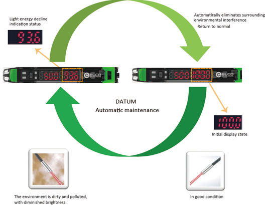 Automatic maintenance function - DATUM: The automatic maintenance function can detect a decrease in brightness due to dirt or other reasons, and restore the sensor to its original display state. This function can eliminate the influence of the surrounding environment, enabling the sensor to continuously perform high-precision detection.